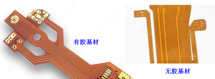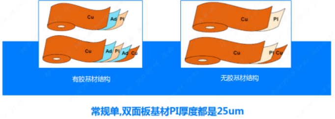 有膠基材(adhesive-coated laminate):在銅與PI之間多了一層AD膠,成本低,容易老化,只能長期工作溫度約105 ℃以下,當溫度在130-140℃時,會產(chǎn)生有毒氣體,未固化的膠有粉塵危害,會導致粘膜組織糜爛,長期引起的肺炎,肺氣腫,甚至是肺癌,且會損傷眼鏡,因此已逐漸被淘汰。