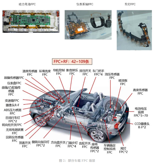 隨著汽車電動化、智能化發(fā)展,F(xiàn)PC在彎折性、減重、自動化程度高等優(yōu)勢進(jìn)一步體現(xiàn),F(xiàn)PC 在車載領(lǐng)域的用量不斷提升,應(yīng)用涵蓋車燈、顯示模組、BMS/VCU/MCU 三大動力控制系統(tǒng)、傳感器、高級輔助系統(tǒng)等相關(guān)場景。新能源汽車的大發(fā)展帶動車載動力電池用 FPC 需求大幅增長。