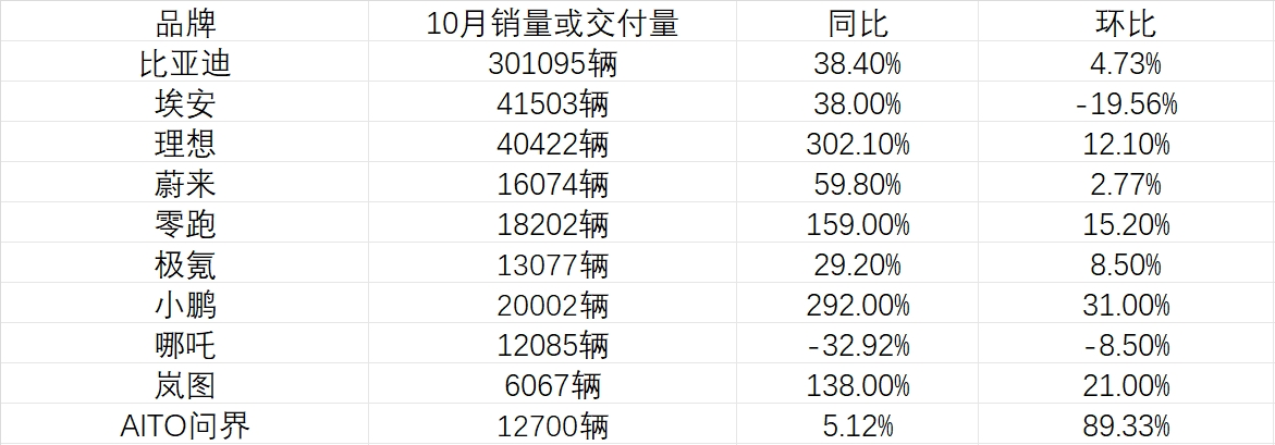軟板廠了解到,11月1日,新能源車企相繼曬出10月銷售成績單,亮點眾多。比亞迪首次超越30萬輛大關(guān),理想汽車首次突破4萬、小鵬汽車強(qiáng)勢反彈至2萬關(guān)口以上、剛與Stellantis牽手的零跑創(chuàng)單月交付新高、而“遙遙領(lǐng)先”的AITO問界大爆發(fā)如約而至。
