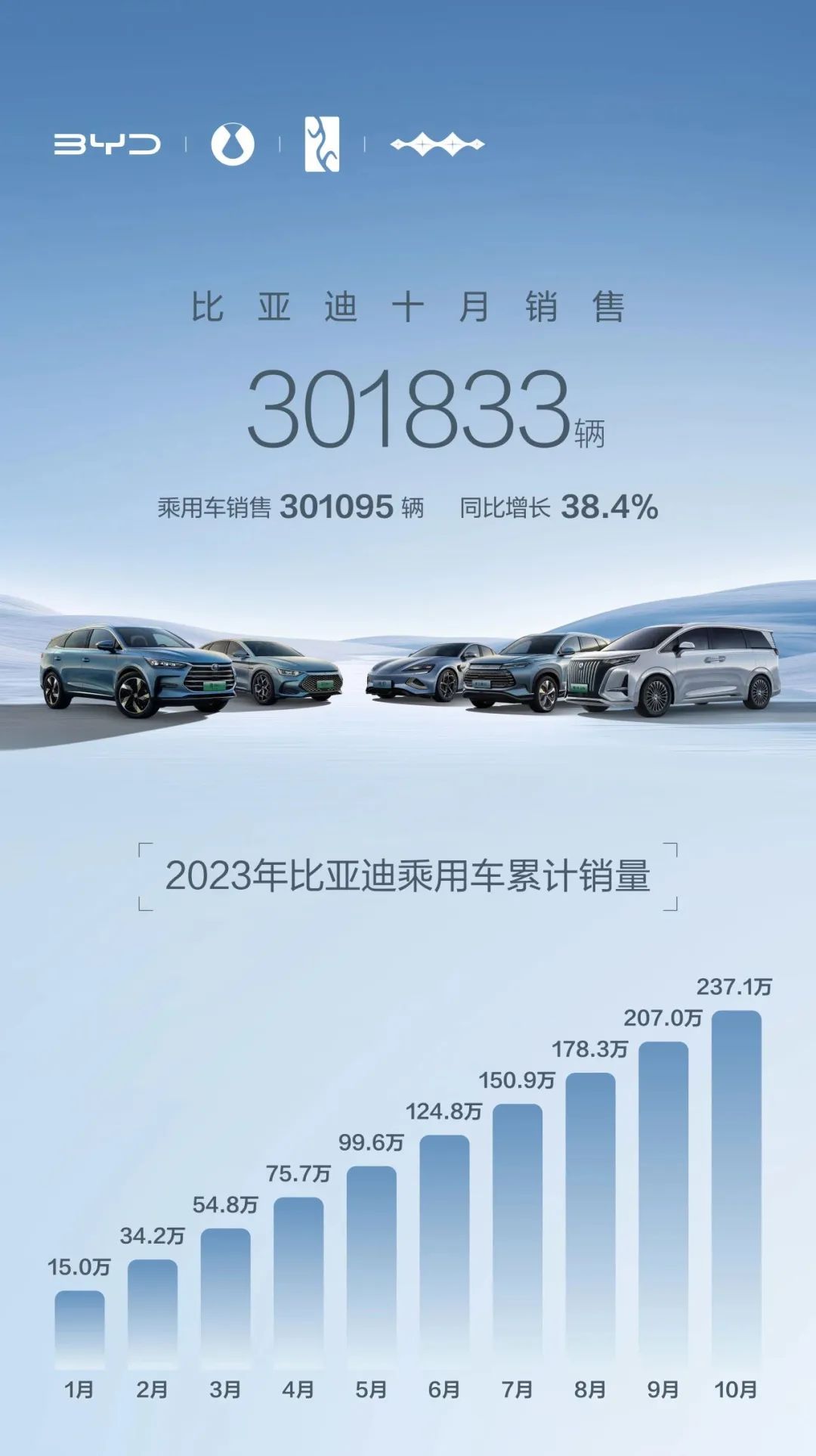 根據(jù)比亞迪公告顯示,其10月新能源汽車銷量為30.18萬輛,較上年同期的21.18萬輛同比增長38.4%,成為首個月銷超過30萬輛的中國汽車品牌。