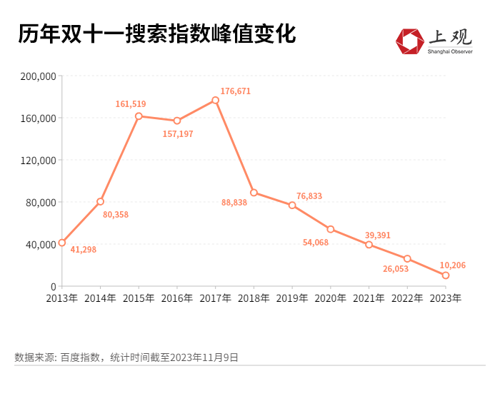 百度指數(shù)顯示,“雙十一”的熱度是一年不如一年。其搜索量在2017年達(dá)到峰值,此后逐年下降。今年更是可以稱為一個(gè)“冰點(diǎn)”,峰值搜索量較去年同期下降了60%,離曾經(jīng)巔峰期的關(guān)注度更是差距甚遠(yuǎn)。