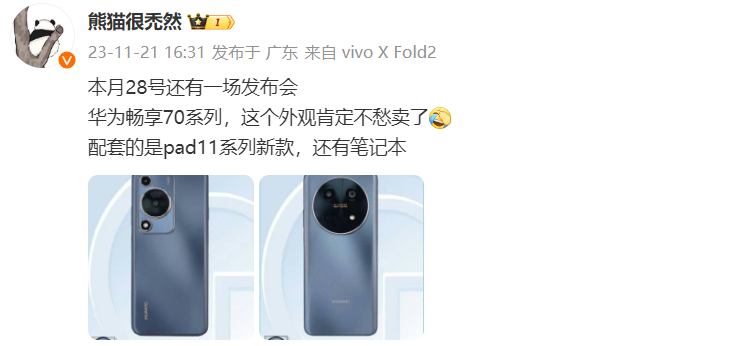 據(jù)博主 @熊貓很禿然 透露,華為暢享 70 系列、新款 MatePad 11 平板、新款筆記本電腦將于11月28日同步推出。