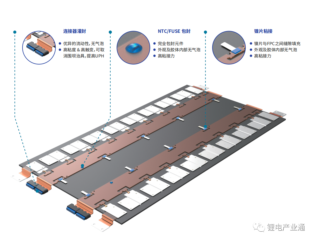 電池連接系統(tǒng)需要保證密封性和安全性,如高壓連接器、NTC、鎳片、Fuse等部件。高效方案是采用點(diǎn)膠工藝,對(duì)材料特性的要求很高,首先是在生產(chǎn)過程中,要保證粘合劑可以完全固化,優(yōu)異的流動(dòng)性填充連接器內(nèi)部,另外不能對(duì)塑膠基材微腐蝕,否則會(huì)導(dǎo)致失效,如粘接不足元器件脫落、離子遷移焊點(diǎn)腐蝕、粘合劑材料表面溶蝕、連接器耐壓失效等。
