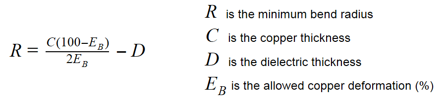 可以使用IPC-2223B公式(公式1表示單面,公式2表示雙面,等等),根據(jù)銅的允許變形程度和其他材料特性,來確定最小允許彎曲半徑部分。