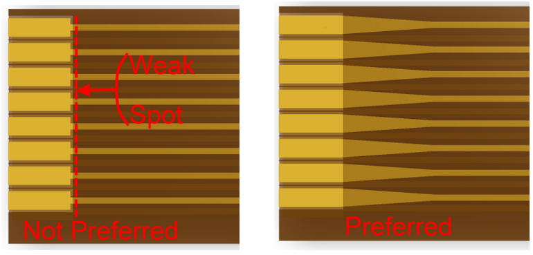 軟板走線鏈接到焊盤時,特別是整理排列的柔性電路終端(如下圖所示),將會形成一個薄弱的著力點,隨著時間的推移銅皮很容易老化。除非使用加強板或者應(yīng)用過程中不會彎折,否則建議采用如下的逐漸變窄的接線方式(提示:在柔性電路板中對于焊盤和過孔進行淚滴處理?。?/p>