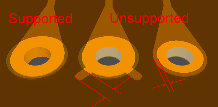FPC由于采用了低粘性的粘合劑(相對于FR-4),柔性電路上的銅更容易從聚酰亞胺基板上脫離。所以給裸露的銅皮提供加固尤為重要。涂鍍的通孔為2個柔性層提供了恰當(dāng)?shù)腻^定,所以使用過孔是非常好加固方式。正因如此(提供了z軸的擴展),許多加工廠建議在軟硬結(jié)合板和柔性電路上添加深度達1.5密耳的涂鍍通孔。表面貼裝的焊盤和非涂鍍的通孔焊盤本身沒有加固措施,所以需要額外的加固來防止脫離。