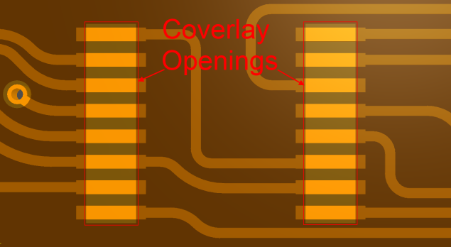 SMT元件焊盤是最脆弱的,尤其柔性電路會在元件的剛性引腳和焊盤下彎曲。圖5和圖6顯示了如何使用覆蓋層在焊盤的兩端加固焊盤。做到這一點,柔性板上的焊盤必須要比典型的剛性板上的焊盤大一些。在看圖6的對比,柔性板上安裝元件的SMD焊盤。這會顯著降低了柔性電路元件的安裝密度,但與剛性電路相比,柔性電路的密度本來就不能太高。