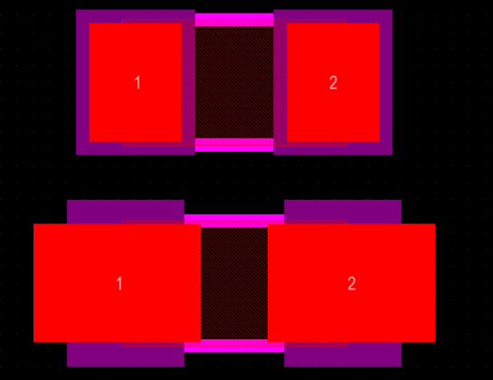 圖6:調(diào)整焊盤尺寸和覆蓋層的開孔。上面是典型的0603封裝形式,下面是為了使用覆蓋層加固修改的封裝形式。