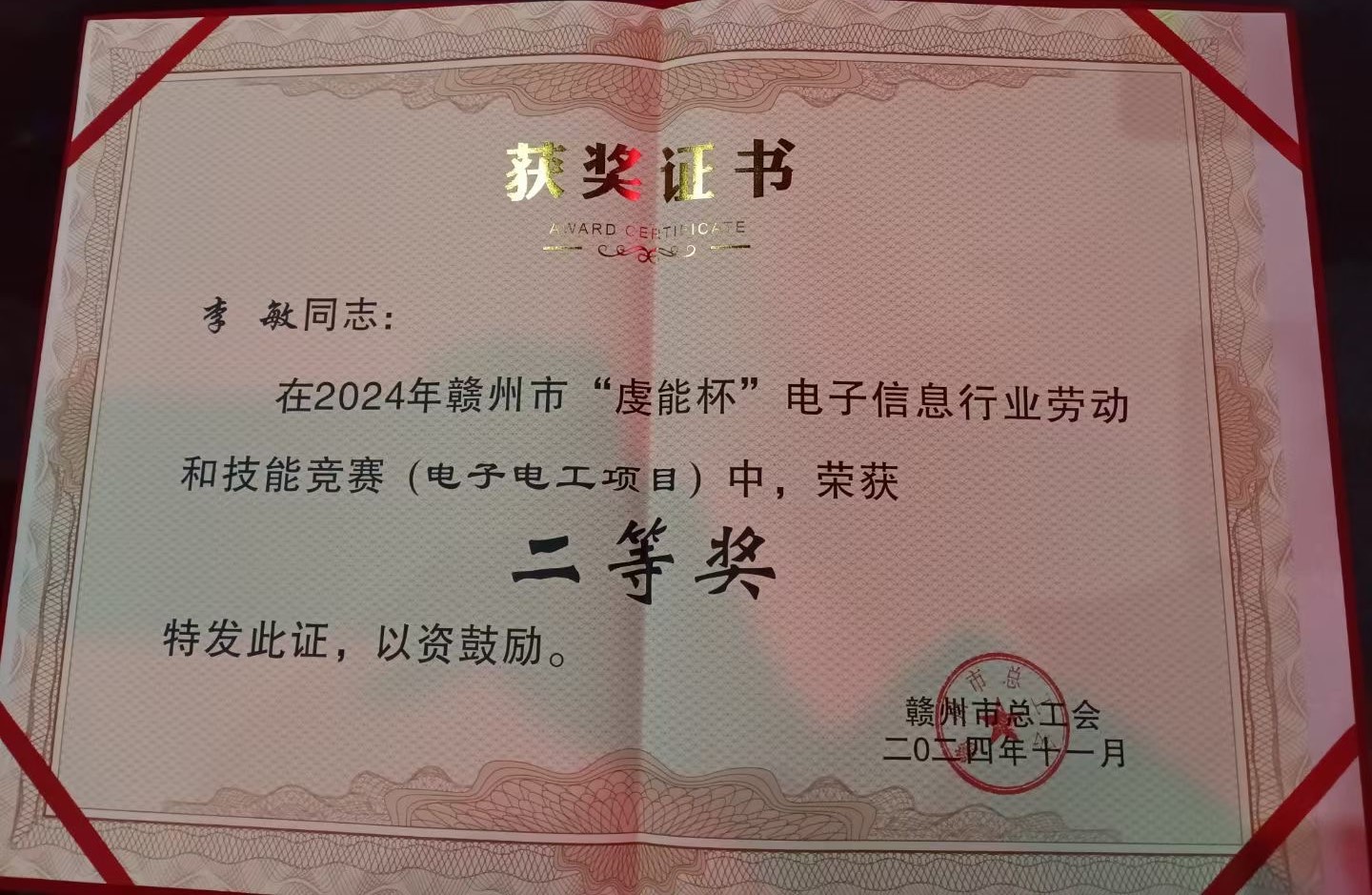 維修部李敏以優(yōu)越成績獲得2024年贛州市“虔能杯”電子電工技能大賽二等獎;贛州市總工會“個人勞動模范稱號”表彰。