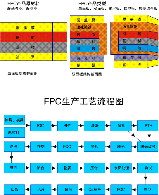 單面板制程:開料→ 鉆孔→貼干膜 → 對位→曝光→ 顯影 →蝕刻 → 脫膜→ 表面處理 → 貼覆蓋膜 → 壓制 → 固化→表面處理→沉鎳金→ 印字符→ 剪切→ 電測 → 沖切→ 終檢→包裝 → 出貨