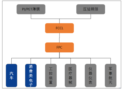 軟板產業(yè)鏈上游主要原材料包括撓性覆銅板(FCCL)、覆蓋膜、元器件、屏蔽膜、膠紙、鋼片、電鍍添加劑、干膜等八大類,其中FCCL的板材膜常見的有聚酰亞胺膜(PI)、聚酯(PET)、聚萘二甲酸乙二醇酯(PEN)、液晶顯示屏高聚物(LCP)等高分子材料塑料薄膜;中游為FPC制造;下游為各類應用,包括顯示/觸控模組,指紋識別模組、攝像頭模組等,最終應用包括消費電子、通訊設備、汽車電子、工控醫(yī)療、航空航天等領域。