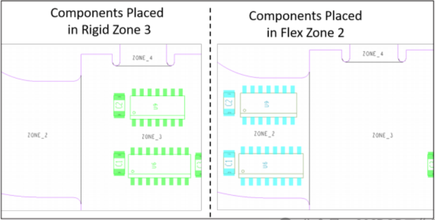 智能元件布局是將元件放置在剛性或柔性區(qū)域,并將其自動(dòng)放置在該區(qū)域的最高元件層的能力。在這兩種柔性狀態(tài)下,我們還需要檢查z軸元件之間的間隙。