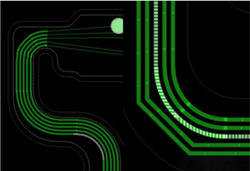 弧形角布線是對(duì)具有彎曲角而不是正交(45°)角的走線進(jìn)行布線的能力。柔性電路板設(shè)計(jì)要求使用彎曲的走線對(duì)總線線路進(jìn)行布線以減少應(yīng)力,因此我們必須使用弧線進(jìn)行布線。