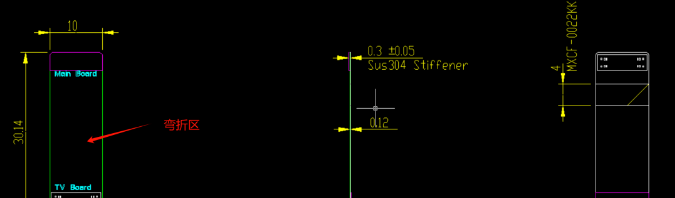 可以隨意彎折是FPC軟板的最大優(yōu)勢,因此它的彎折區(qū)要特別關(guān)注下,這是一個(gè)FPC項(xiàng)目中結(jié)構(gòu)工程師給出的一個(gè)三視圖圖紙,這是一個(gè)副板連接主板的FPC排線,中間部分就是需要彎折的地方。