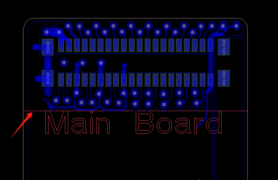 FPC設(shè)計(jì)中,對彎折區(qū)的要求很高,第一點(diǎn)就是彎折區(qū)內(nèi)不能打孔,打孔會(huì)使彎折區(qū)銅硬度變大,影響彎折的效果和降低FPC壽命。如下圖所示,箭頭所指線以下為彎折區(qū),BTB連接器的換層走線孔必須避開彎折區(qū),不能在彎折區(qū)打孔。