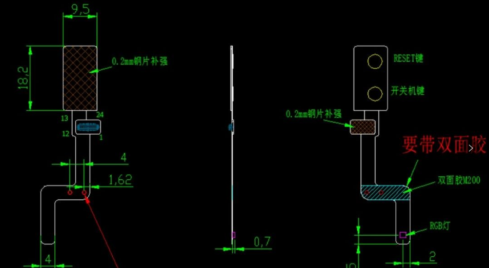 因?yàn)镕PC軟板很薄,一般雙面板厚度0.08-0.13mm,如果在FPC上貼裝連接器,就需要在連接器下板子的另外一面進(jìn)行補(bǔ)強(qiáng),如下圖所示,結(jié)構(gòu)給出的加工圖紙中給出了補(bǔ)強(qiáng)區(qū),在側(cè)鍵和BTB連接的背面使用0.2mm的鋼片進(jìn)行補(bǔ)強(qiáng)設(shè)計(jì)。