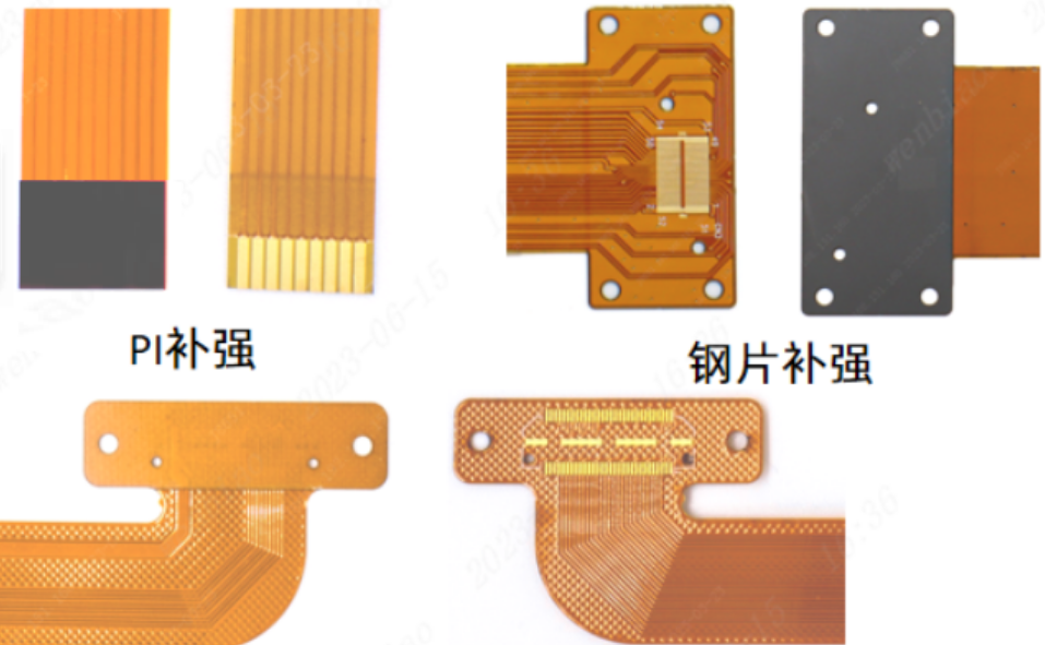 軟板廠FPC補(bǔ)強(qiáng)的材質(zhì)一般有PI、FR4和鋼片3種,如下圖所示,補(bǔ)強(qiáng)區(qū)一般在金手指、按鍵或連接器的背面,對補(bǔ)強(qiáng)區(qū)的要求就是不能放置元器件和絲印文字等,比如絲印文字,補(bǔ)強(qiáng)后文字就被遮擋了。